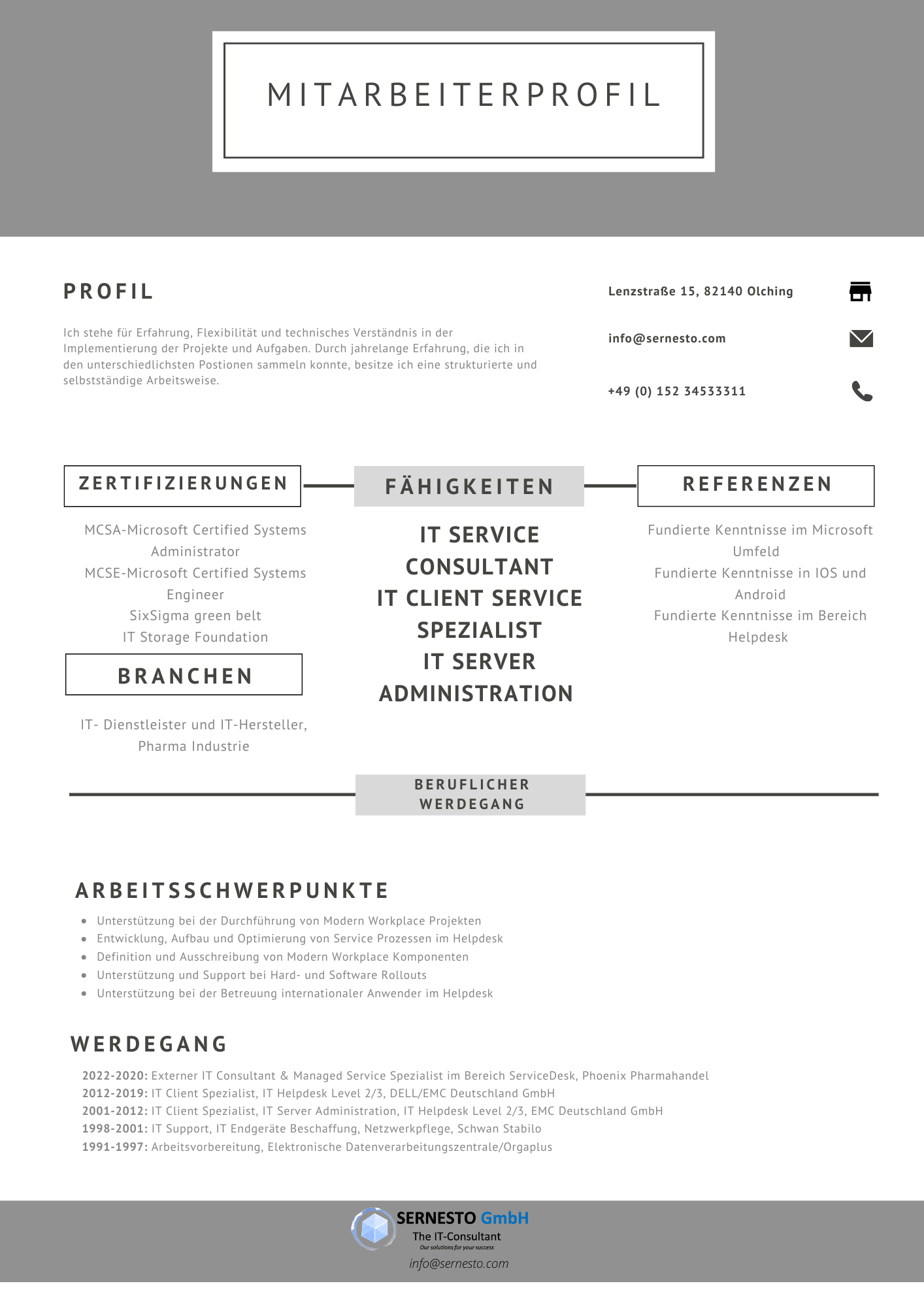 Unser Mitarbeiter zeichnet sich vor allem durch langjährige Erfahrung als IT-Service Consultant, IT-Client Service Consultant und IT-Server Administrator aus.